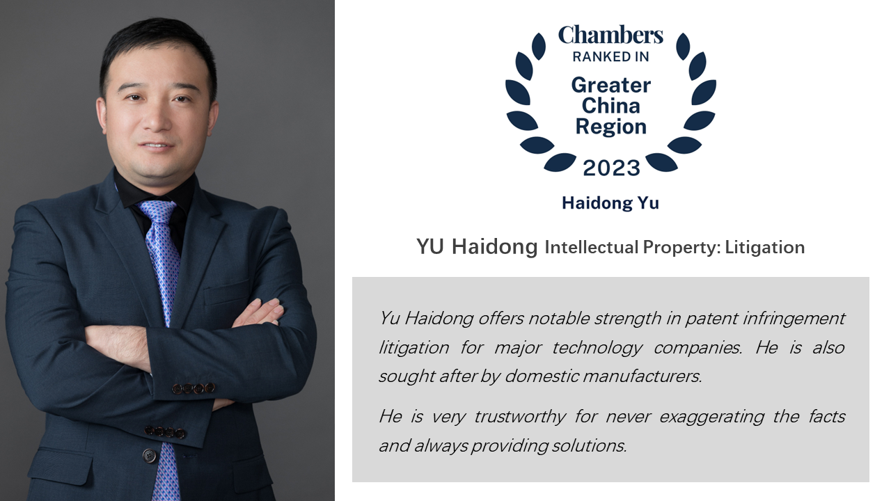 XIE Guanbin, ZHANG Bin, and YU Haidong were on the list of Leading Individuals for Intellectual Property: Litigation. And WU Li was recommended for Intellectual Property: Non-litigation. In particular, XIE Guanbin has, for years in a row, been ranked as a Band 1 Leading Individual.