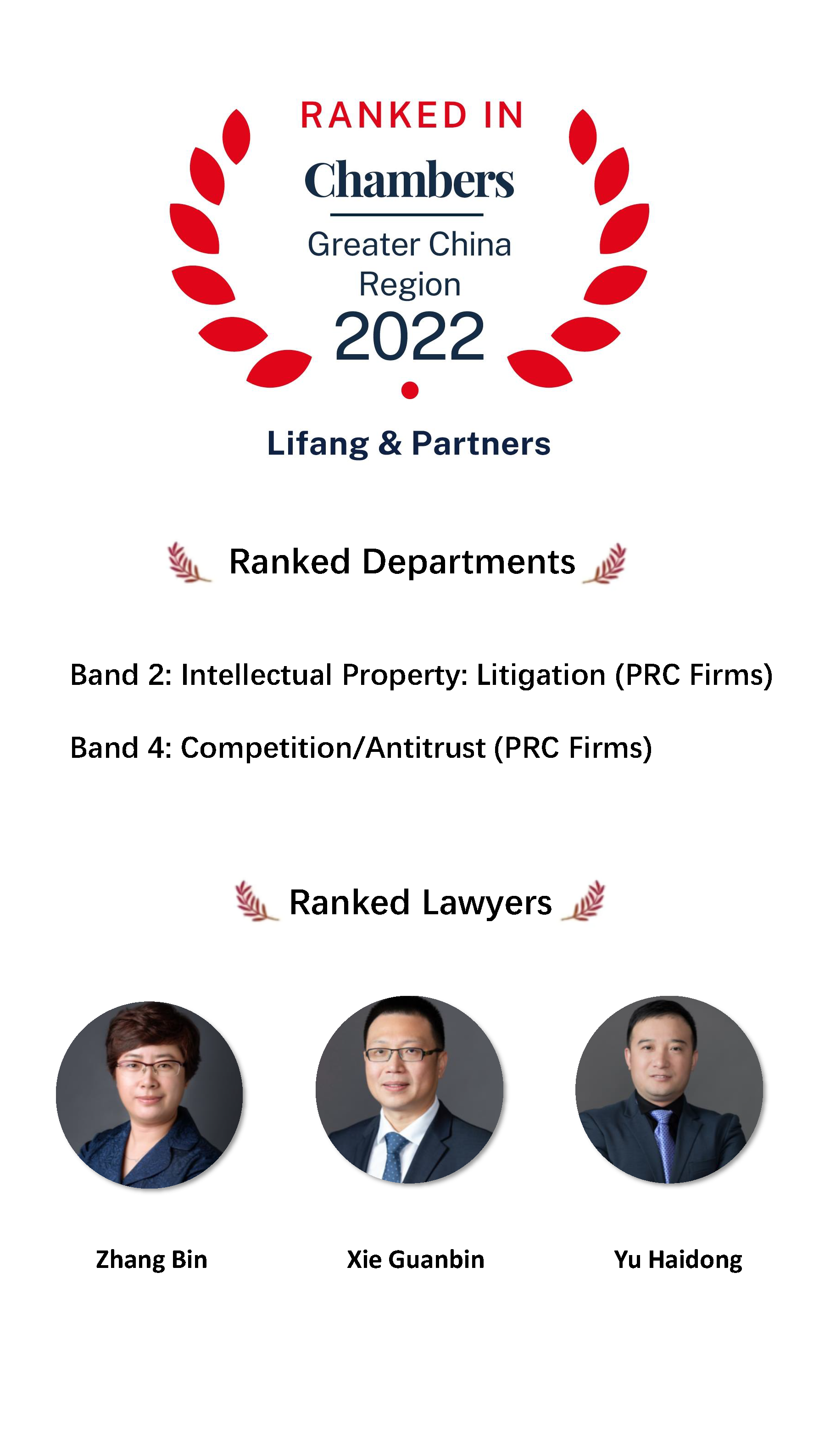 XIE Guanbin, ZHANG Bin and YU Haidong were on the list of Leading Individuals for Intellectual Property: Litigation. In particular, XIE has, for years in a row, been ranked as a Band 1 Leading Individual.